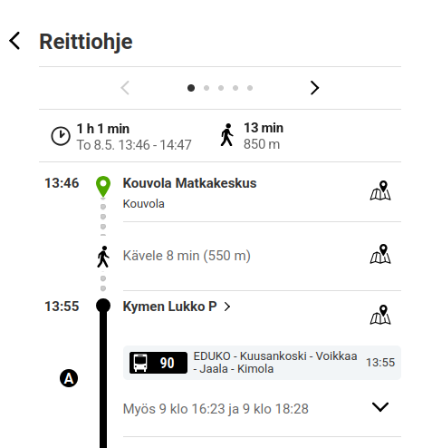 Ongelma: Bussi nro 90 Lähtee kuitenkin Matkakeskukselta klo 13:40. Miksi reittiopas ei pysty näyttämään tätä vaihtoehtoa? Kyllähän yhteys on nopeajalkaiselle tuon 3 minuuttia nopeampi. Mutta pannapa nyt turisti kulkemaan 850 metriä parin matkalaukun kera etsimään ja ihmettelemään missä tuo "Kymen Lukko P" pysäkki mahtaisi sijaita.